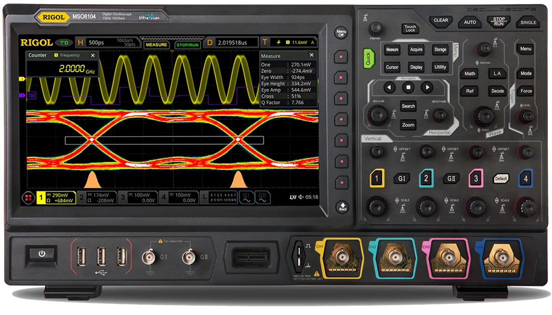 В серии представлены модели с полосой пропускания 600 МГц, 1 ГГц и 2 ГГц, имеющие 4 аналоговых измерительных канала. У осциллографов RIGOL серии MSO8000 добавлена опция анализа джиттера и глазковых диаграмм в реальном времени в дополнение к другим функциям UltraVision II, включая возможности зонального запуска, интеграцию в одном устройстве 7 независимых средств измерения, расширенные возможности функции БПФ, отображение градациями интенсивности цвета и в виде гистограммы при полной поддержке высокой частоты дискретизации, большой глубины памяти и измерений по всей памяти отсчетов. Осциллографы RIGOL серии MSO8000 обеспечивают беспрецедентные результаты измерений и инновации, благодаря быстродействующей интегрированной платформе.
